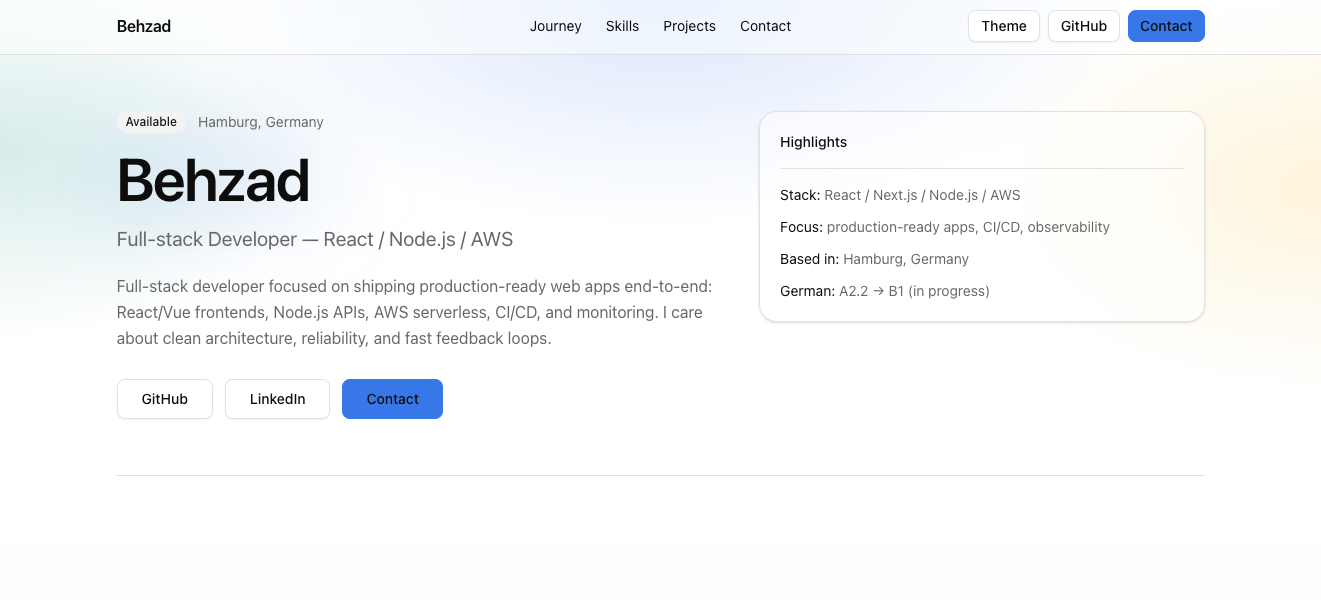 GitHubCurrently based in Hamburg. Open to full-stack roles (React/Node/AWS).
